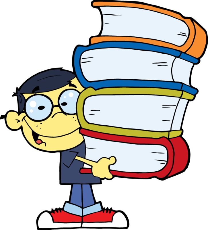boy with glasses holding 4 big books